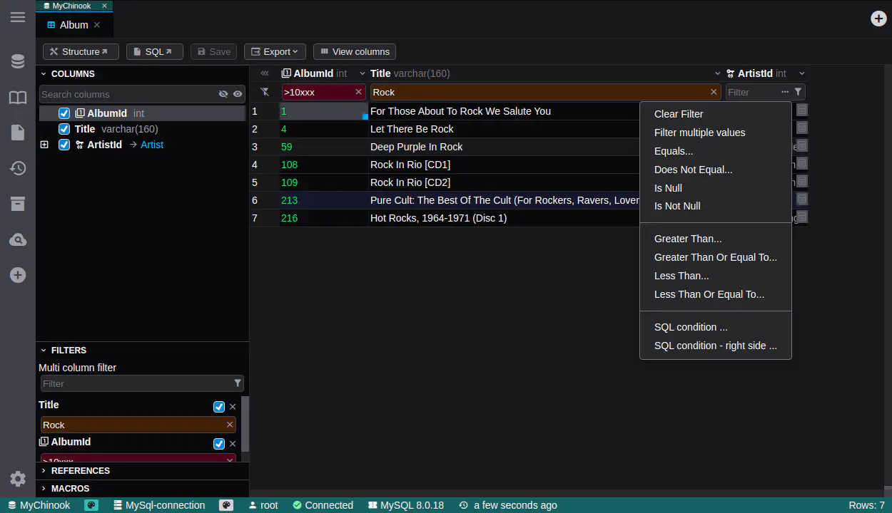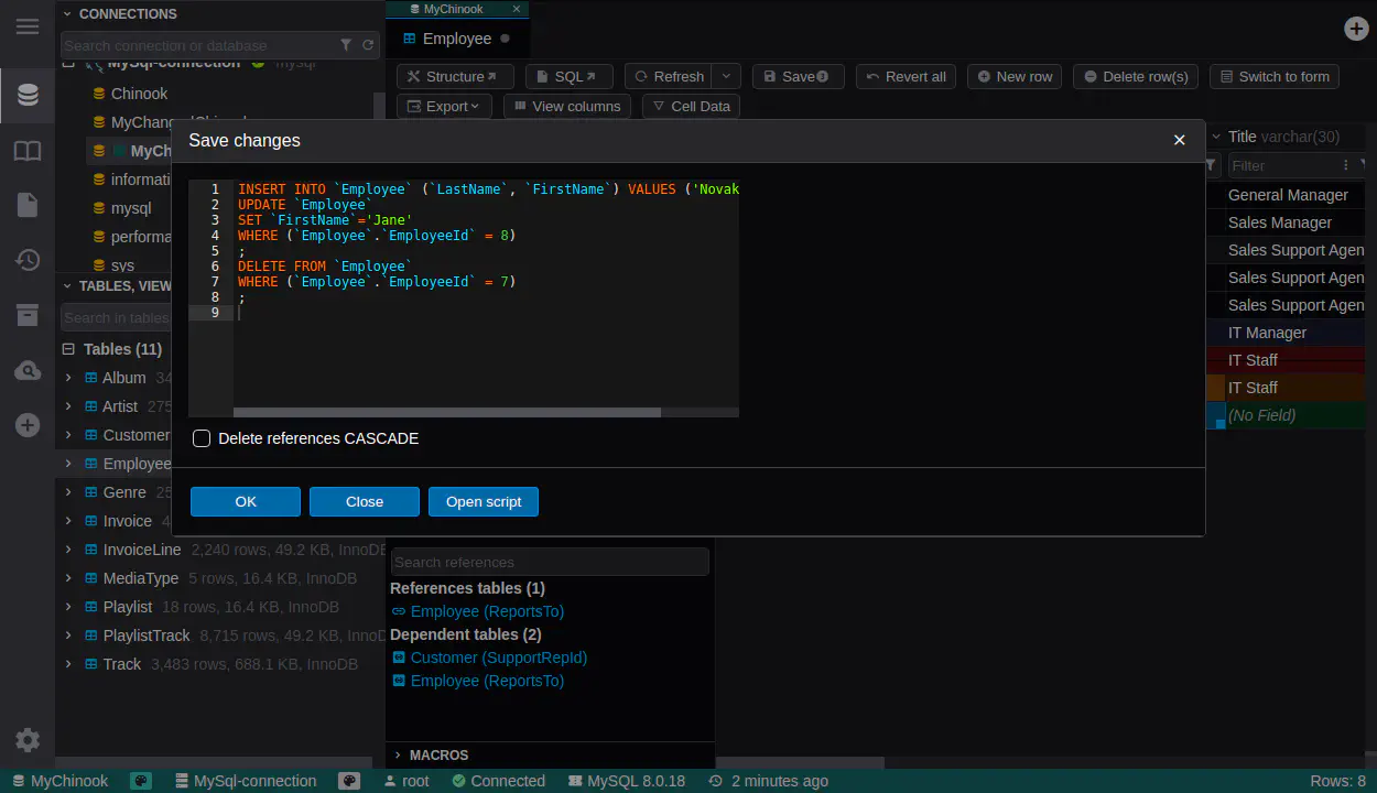 DbGate has very powerful data browser and editor. It allows you to quickly find or modify, what you need, even when using complicated relations.