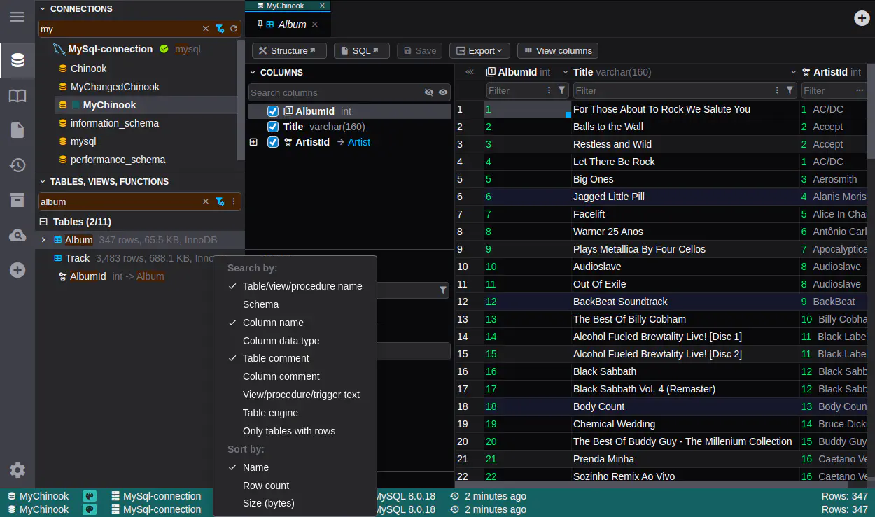 Search everywhere - use powerful search logic, use Ctrl/Cmd+P for search among databases, tables (and other DB objects) and commands