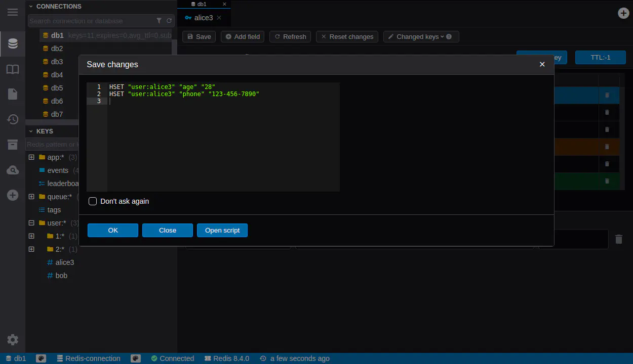 Edit multiple keys - modifications of database are performed in the same way as in other DbGate supported databases. All changed keys are saved in a single transaction after clicking “Save” button. You could also check preview of generated commands before saving.