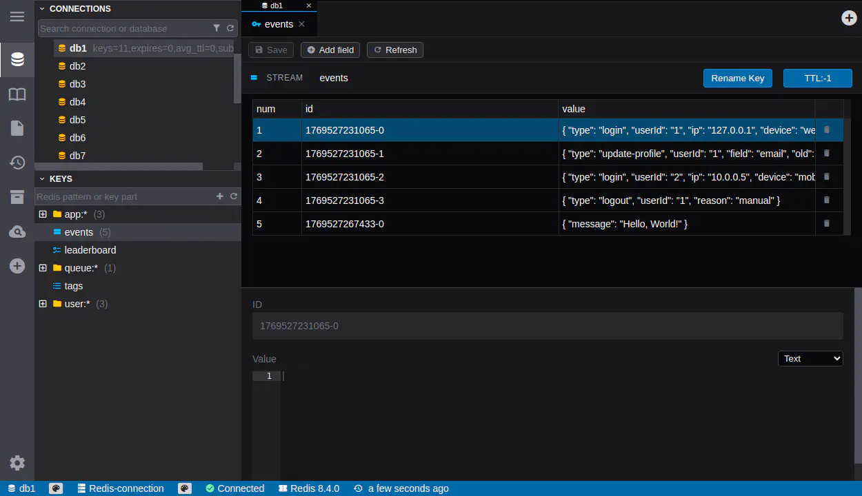 Redis Stream support - fully manage Redis Streams, including creating new and delete existing stream entries
