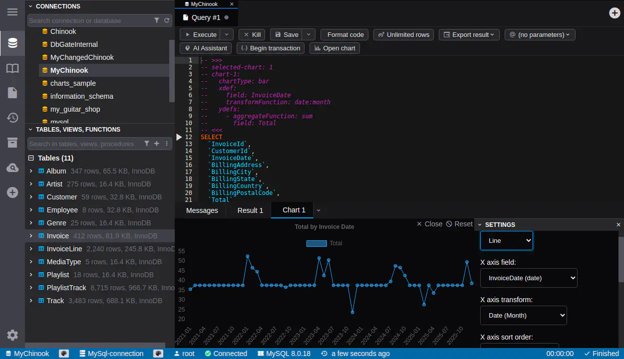DbGate has complete new charting engine. Charts are automatically created from query result. Of course, you could configure everything, if you are not satisfied with auto-detected measures. Chart definition is saved to the begining of SQL query (as SQL front matter), so you will see the same chart after reopening saved SQL query.