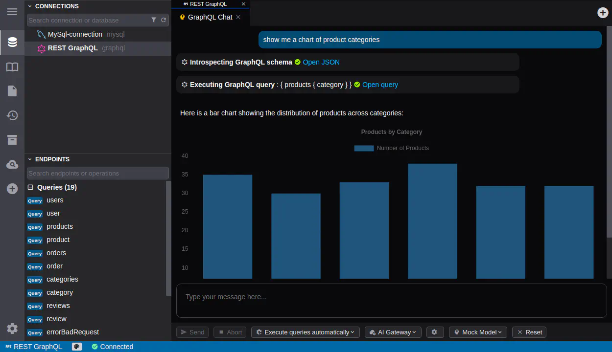 GraphQL Chat combines DbGate’s GraphQL connectivity features with advanced language models to provide an intuitive way to query your API endpoints without writing GraphQL syntax manually.