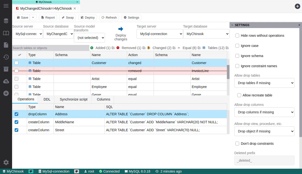 DB compare settings