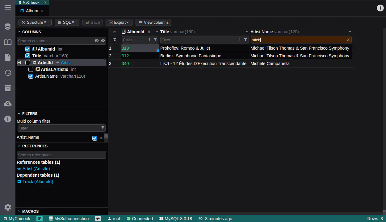 DbGate supports master-detail views, letting you see related records from different tables side by side. You’ll find available views in the “References” section – they’re automatically detected from the foreign keys in your database schema.